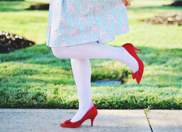 I like a combination of red seamed stocking and red shoes a lot! The dress is very lovely too ๐ Awe, are you going to Paris? So jealous! Havent ben there for ages, hope you will have a great time, dont forget to visit Disneyland ;):)