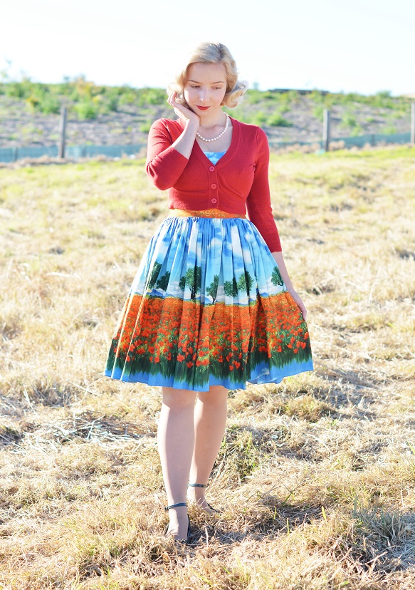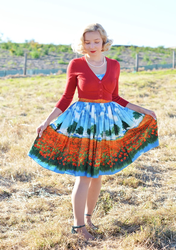 I love the cardi as well, it looks fantastic and brings out the red flowers in the dress, and the way you are doing your hair is just perfect.